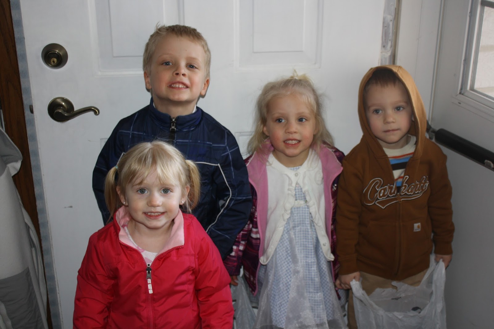My parents hosted the Skala family Easter and the four youngest egg hunters searched in the driveway among the cars for some eggs and treats because the grass was too wet and muddy....Conor, Riley, my cousin's son J.W., and my niece Carmen